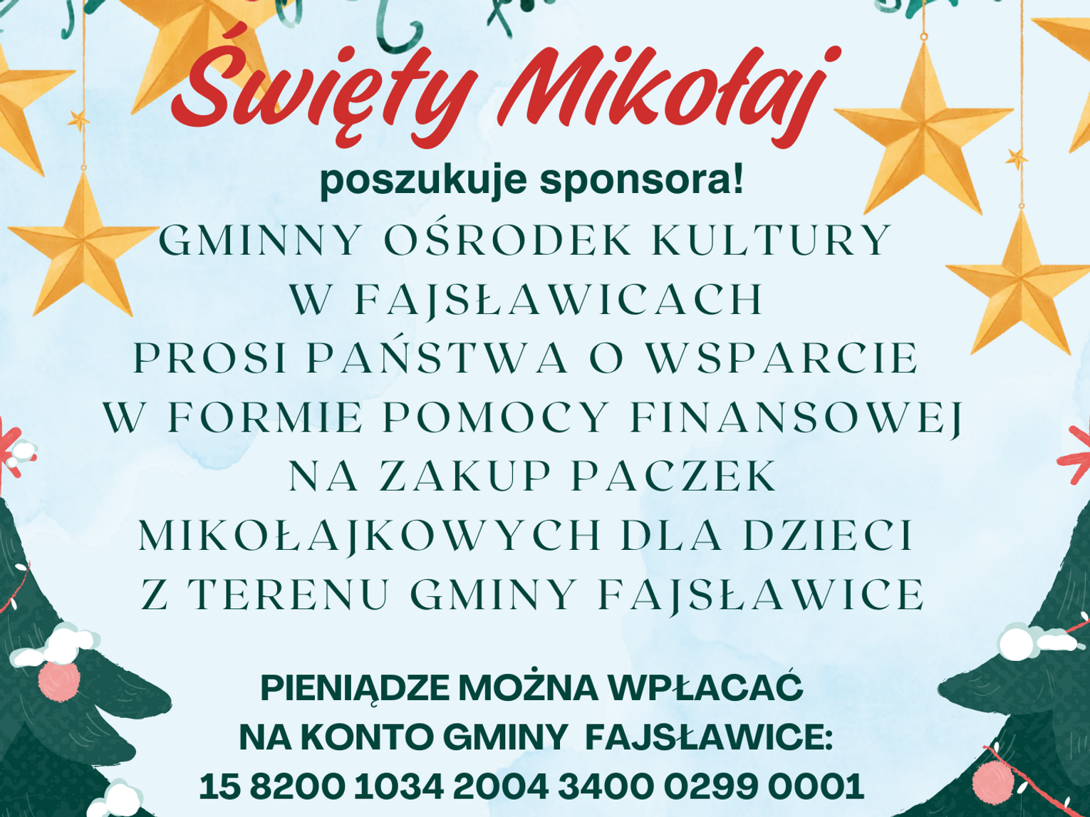 W tym roku GOK Fajsławice planuje przygotowanie paczek mikołajkowych dla dzieci z terenu Gminy Fajsławice, wszystkich dzieci niepełnosprawnych z terenu Gminy Fajsławice oraz dzieci z „Nasz Dom” im. bł. Edmunda Bojanowskiego Zgromadzenia Sióstr Służebniczek NMP NP w Tuligłowach