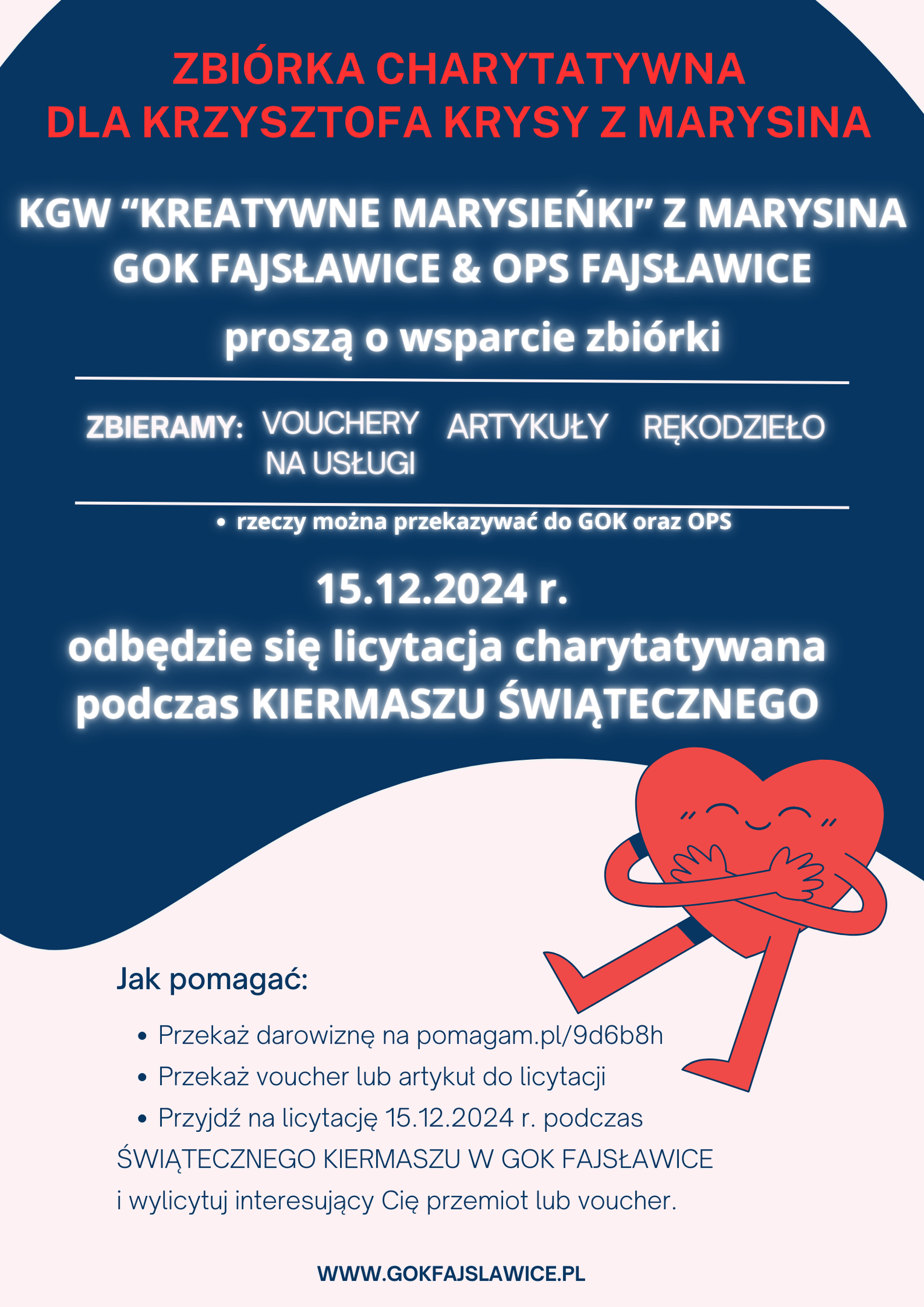 Zachęcamy serdecznie do przyłączenia się do zbiórki charytatywnej organizowanej przez KGW "Kreatywne Marysieńki" w Marysinie, Gminny Ośrodek Kultury w Fajsławicach oraz Ośrodek Pomocy Społecznej w Fajsławicach dla Krzysztofa Krysy z Marysina, który w wyniku nieszczęśliwego wypadku stracił nogę. Zebrane środki finansowe podczas zbiórki charytatywnej przeznaczone zostaną na zakup protezy dla Krzysztofa.