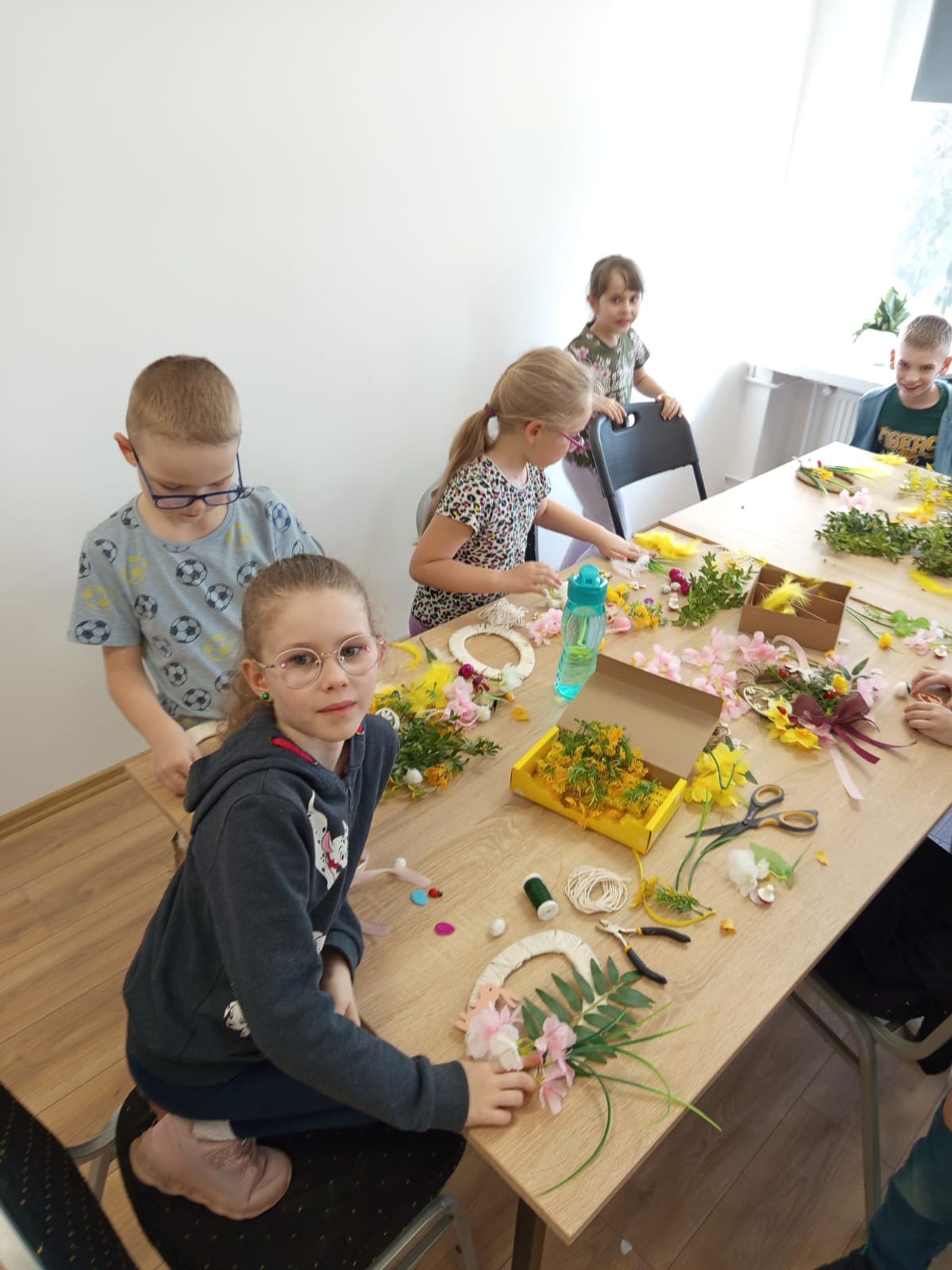 W przyjaznej, twórczej atmosferze dzieci wykonały barwne, wiosenne stroiki z motywami kurczaczków, zajączków i kolorowych kwiatów.