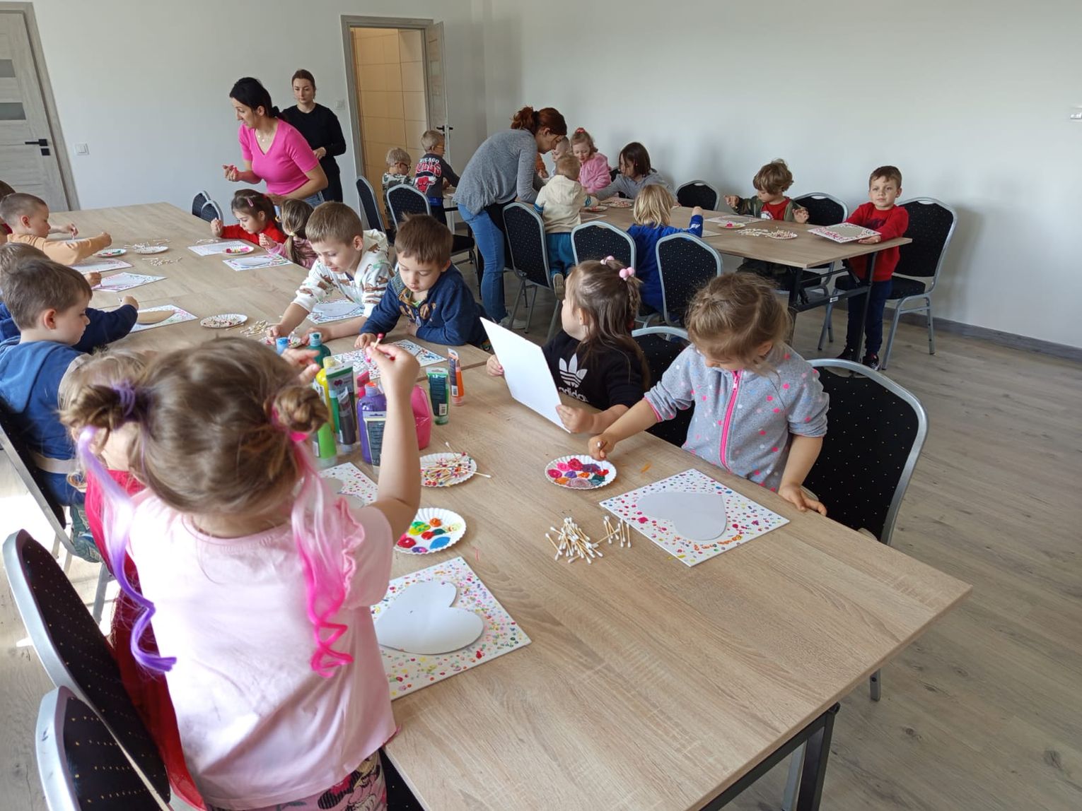 Najmłodsza grupa, prowadzona przez panie Ewę Domańską i Agnieszkę Plutę, zabrała się do pracy z ogromnym entuzjazmem. Dzieci wyklejały serduszka kuleczkami z bibuły, które następnie umieszczały w ramkach z patyczków kreatywnych. Powstały prawdziwe miniaturowe dzieła sztuki – kolorowe, miękkie i pełne dziecięcej miłości.