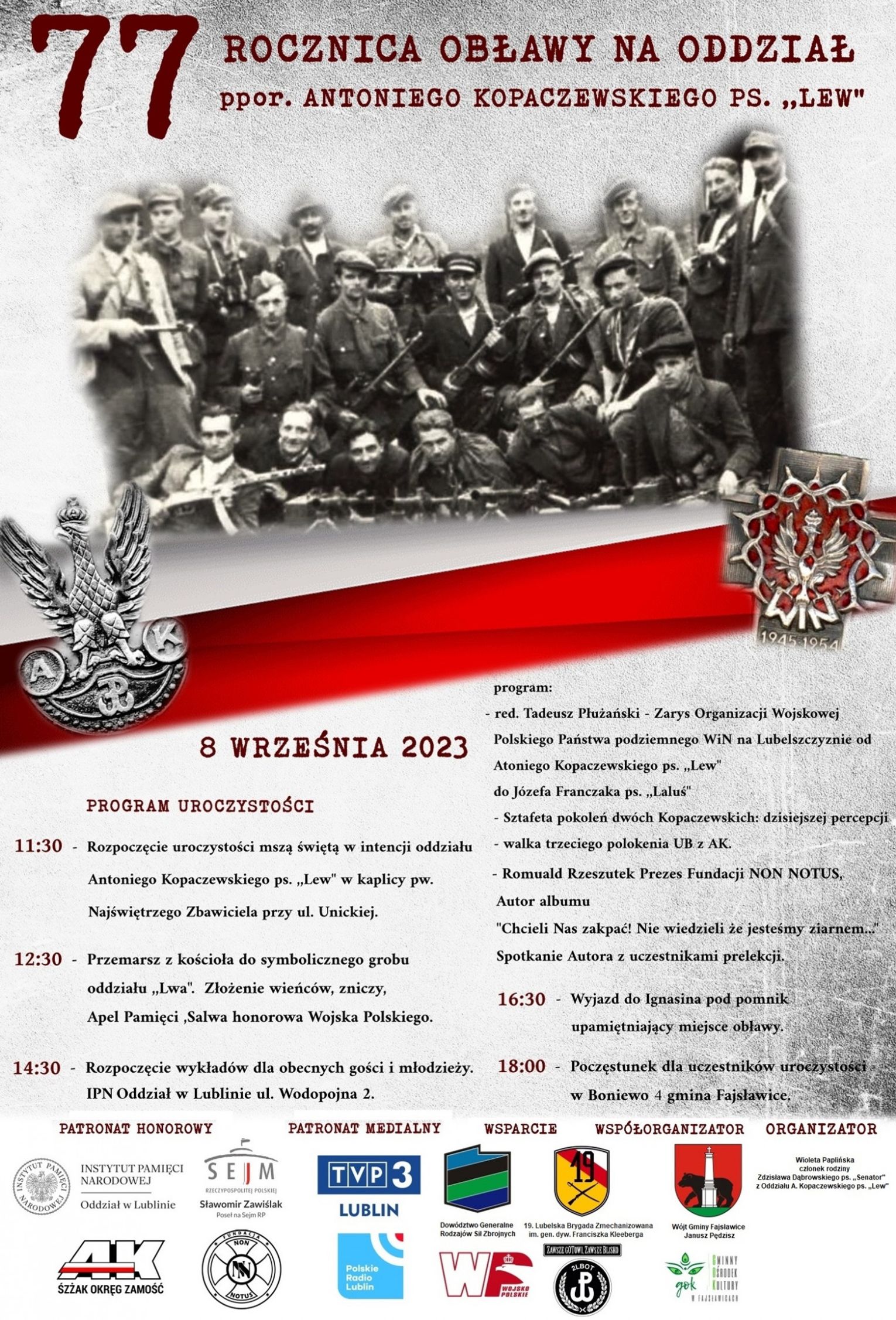 Wójt Gminy Fajsławice Janusz Pędzisz oraz Dyrektor Gminnego Ośrodka Kultury w Fajsławicach Ewelina Mazur-Kluch jako współorganizatorzy uroczystości serdecznie zapraszają do udziału w obchodach 77. rocznicy tragicznych wydarzeń rozegranych na terenie Gminy Fajsławice 8 września 1946r. - obławy na oddział ppor. Antoniego Kopaczewskiego ps. "Lew".