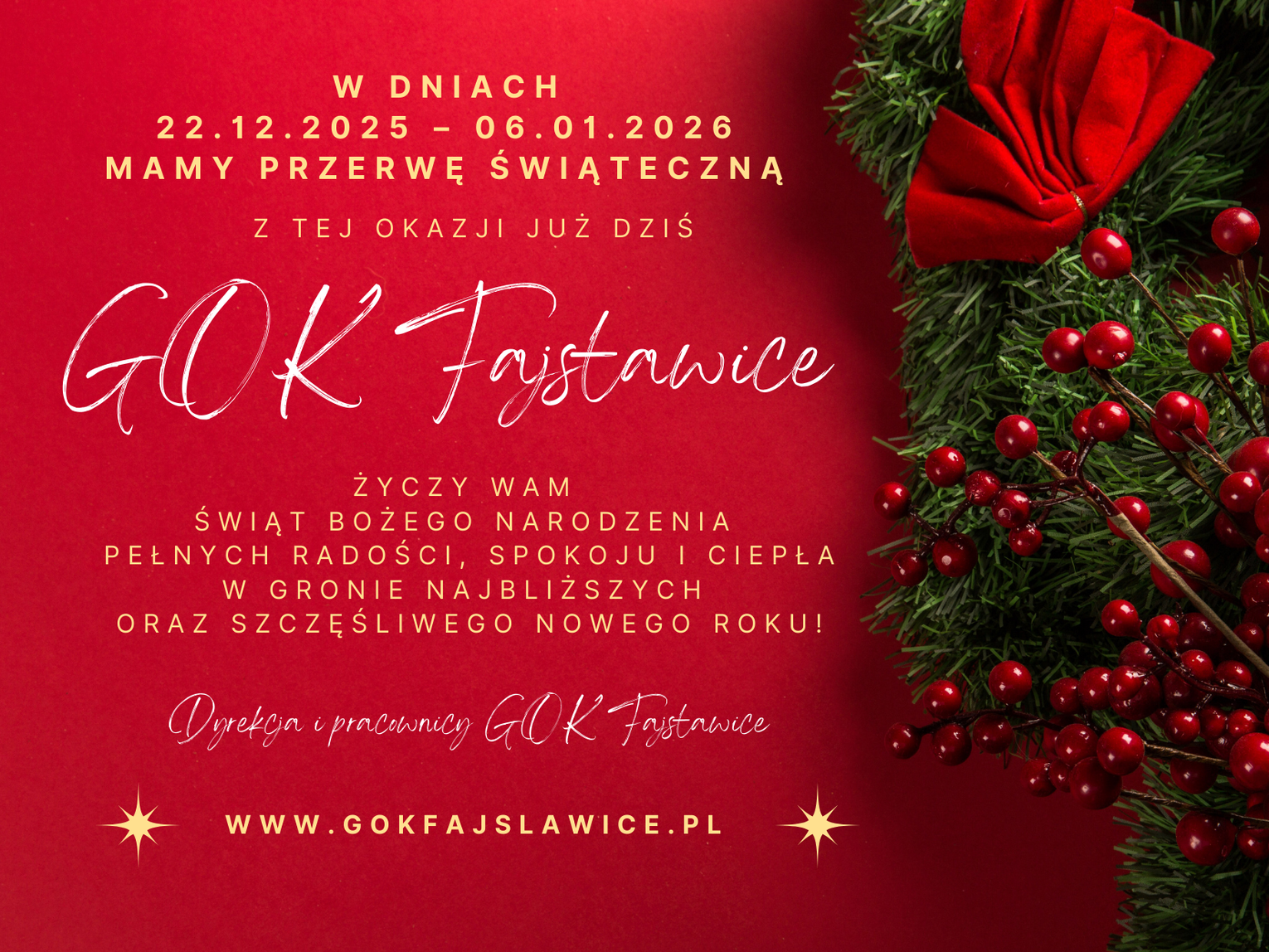 Informujemy, że w dniach 22.12.2025 – 06.01.2026 Gminny Ośrodek Kultury będzie nieczynny z powodu przerwy świątecznej.