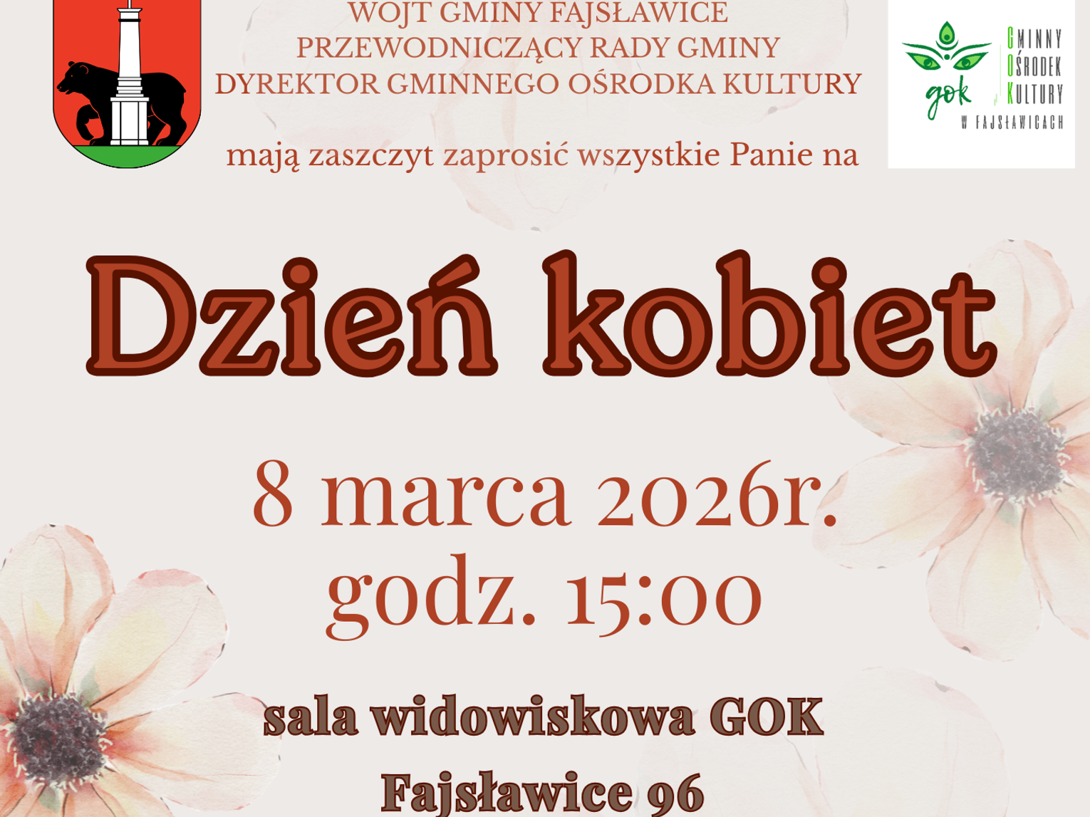 Wójt Gminy Fajsławice, Przewodniczący Rady Gminy oraz Dyrektor Gminnego Ośrodka Kultury serdecznie zapraszają wszystkie Panie z terenu naszej gminy na wyjątkowe świętowanie Dnia Kobiet! 💐