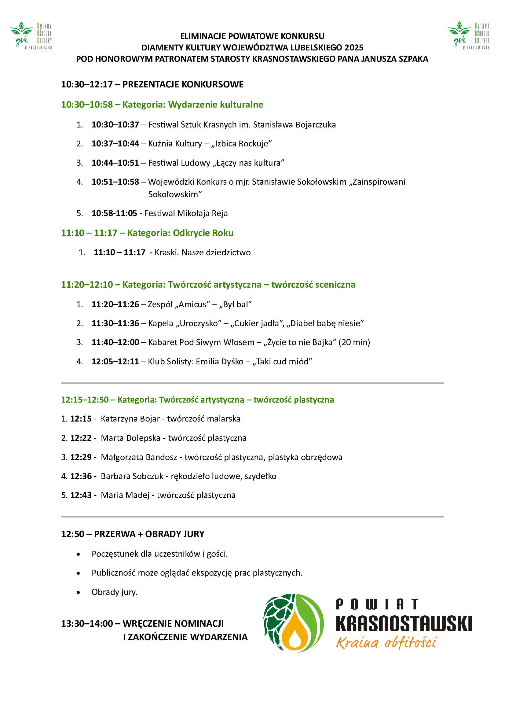 Po zakończeniu prezentacji jury uda się na obrady, a uczestnicy i goście skorzystają z poczęstunku. Kulminacyjnym punktem wydarzenia będzie uroczyste wręczenie nominacji, zaplanowane na godzinę 13:30. Podczas gali poznamy osoby i instytucje, które będą reprezentować powiat krasnostawski na etapie wojewódzkim konkursu.